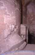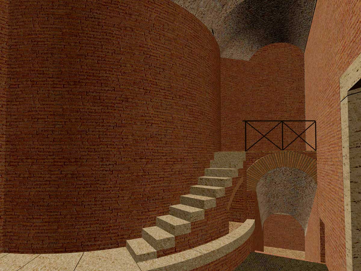 Al muro dell'abside era appoggiata una scaletta in muratura, di cui restano le impronte, che saliva a un ripiano ricavato sopra la volta di un'altra scala, forse utilizzato come guardiola. La scala che scende sulla destra nella sistemazione definitiva dell'edificio risultava cieca. Il passaggio situato a sinistra del pianerottolo sottostante, che doveva immettere nella sala principale dell'appartamento al livello inferiore, venne tamponato in fase di cantiere (cfr. M. Bianchini, "La ricostruzione del Corpo Centrale", in L. Ungaro, M.P. Del Moro, M. Vitti (a cura di), I Mercati di Traiano restituiti. Studi e restauri 2005-2007, Roma 2010 pp. 59-76).
