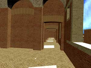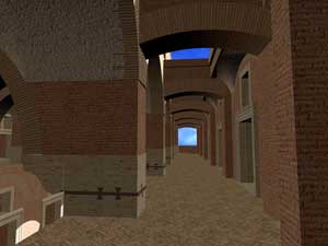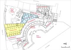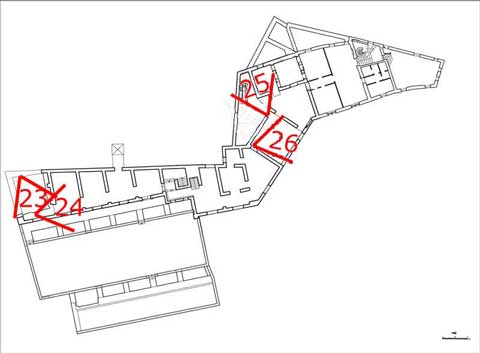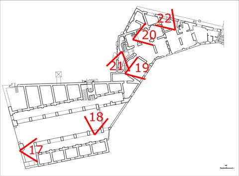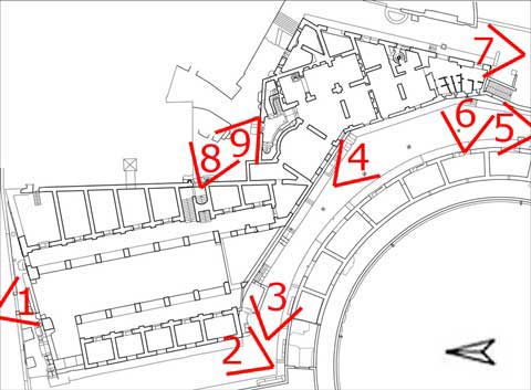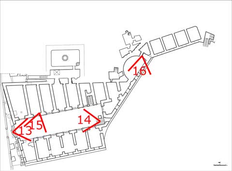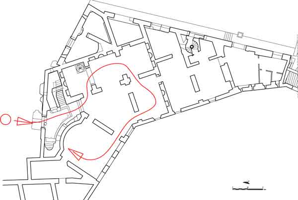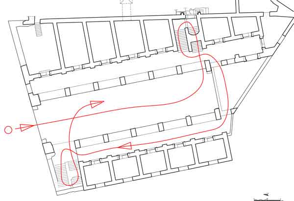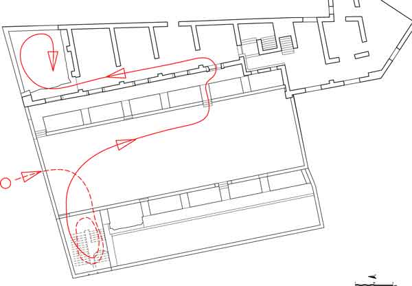 La camera entra nell'edificio per il portale N, attraversa la Grande Aula, sale al piano superiore per il corpo scala SE, percorre la galleria occidentale, ritorna al piano terreno della Grande Aula scendendo il ricostruito corpo-scala NO