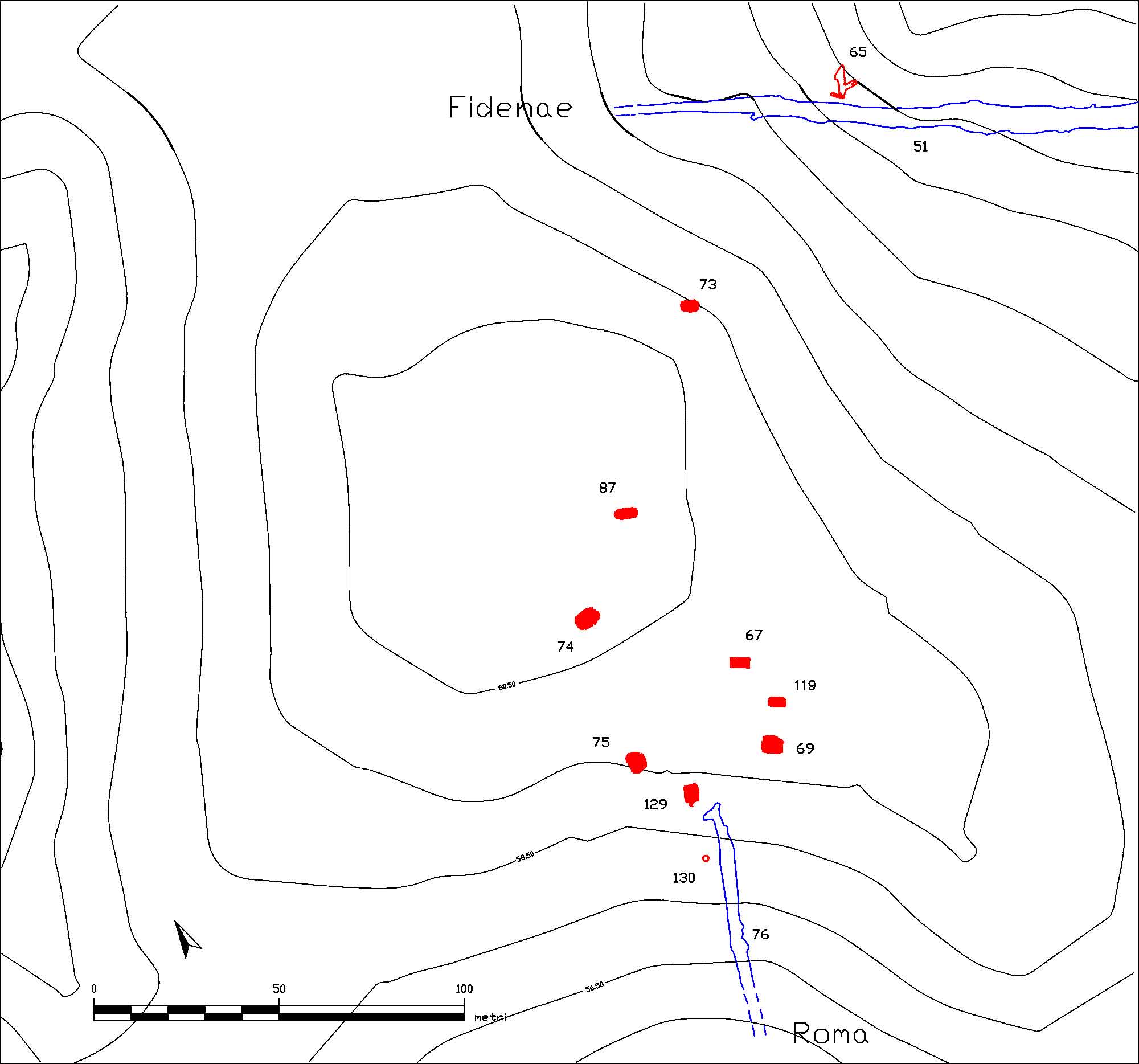 Figura 1 - Le cavità artificiali (in rosso) risultano ubicate in prevalenza sul versante sudorientale di un poggio a SO del quale sono state rinvenute tracce di un impianto agricolo di età arcaica. L'area è inoltre collegata ad un asse viario posto in direzione di Roma (in blu in basso) e risulta adiacente ad un invaso stradale di collegamento tra Fidenae e il distretto nomentano (in blu in alto a destra). Su questo asse si apre un ipogeo con sepolture non databile (n. 65).