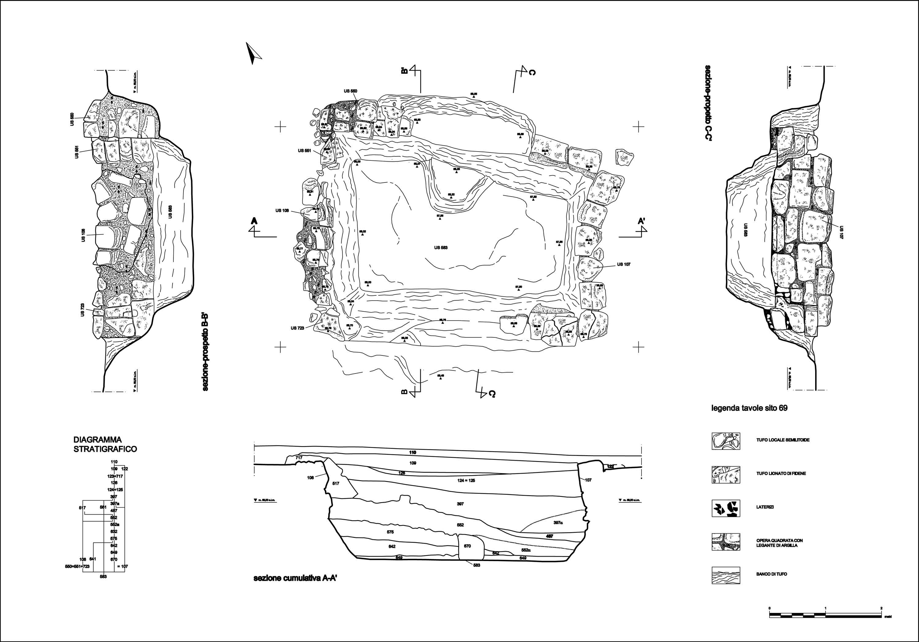 Figura 3 - Pianta, sezioni-prospetto, sezione cumulativa e diagramma stratigrafico del sito 69.