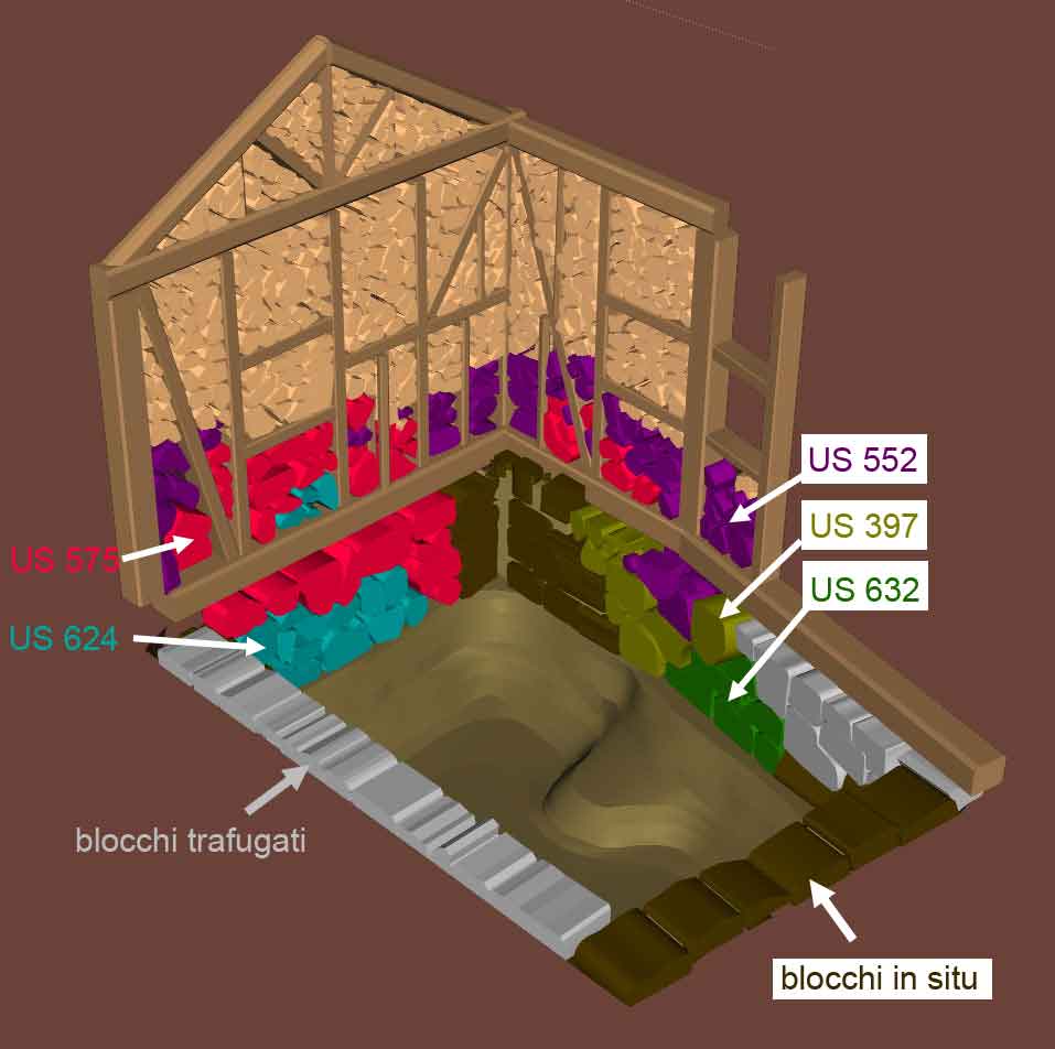 Figura 13 - I blocchi di tufo di maggiori dimensioni provenienti dai vari strati di crollo sono stati ipoteticamente ricollocati nella loro posizione originaria. I colori vivaci distinguono le US di provenienza. In marrone scuro sono indicati i tratti di fondazione in situ. In grigio chiaro è stato ricostruito il volume dei blocchi di fondazione non rinvenuti negli strati di crollo, in quanto furono trafugati dopo la distruzione dell'edificio. Alla fila del lato sud (in basso a sinistra) corrisponde una trincea di spoliazione che è stata poi riempita da un deposito argilloso.