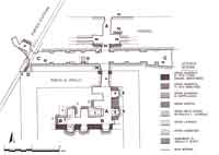 In sintesi le strutture visibili all'interno della cantina dell'ex convento di S.Maria in Campitelli (fig.1) comprendono la parte posteriore del podio del tempio di Apollo, ove coesistono murature della primitiva fase altorepubblicana con quelle pertinenti alla ricostruzione sosiana, nonché le sostruzioni della retrostante pavimentazione e dei pilastri del portico settentrionale dell’area sacra. Tutti questi muri circoscrivevano intercapedini e concamere in origine non percorribili e riempite in gran parte da colmate di argilla o detriti. In epoca moderna i frati del monastero hanno scavato in mezzo a tali strutture tre corridoi aventi funzione di cantine (nota 1) . L'accesso al sotterraneo è stato ricavato al di sotto della fila settentrionale dei pilastri del portico, in corrispondenza del settore nord-orientale del tempio di Apollo. Esso immette, tramite una scaletta, in una galleria lunga circa 18 metri (A), ortogonale al tempio, la quale è stata scavata in direzione sud tagliando rispettivamente una fogna antica che corre al di sotto del portico, la sostruzione del fronte meridionale dello stesso, due muri in opus mixtum di reticolato e laterizio, la sostruzione in opera quadrata di tufo dell'Aniene del muro settentrionale del podio del tempio sosiano, penetrando infine nel riempimento del podio, con percorso tangente a un setto murario in blocchi di tufo semilitoide. Il corridoio termina a ridosso del muro nord in opera quadrata di tufo di Monteverde del podio altorepubblicano del tempio di Apollo Medico. Qui lo scavo dei frati è proseguito in direzione ovest, seguendo il filo di quest'ultima parete e tagliando in parte due grosse strutture in opera cementizia situate a nord di essa, in modo da ricavare un braccio trasversale lungo circa dieci metri (B). Ai lati di questi due corridoi sono stati realizzati, sfondando le murature antiche, dodici vani per l'alloggiamento delle botti, sistemate su muretti appositamente costruiti, le quali hanno lasciato in alcuni casi l'impronta circolare sul retrostante strato di argilla e detriti che ancora riempie l’interno del podio.