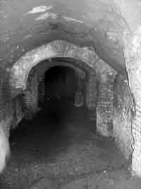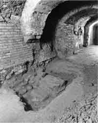 La realizzazione della cantina comportò varie opere di consolidamento. Nel corridoio C la volta originaria dell’intercapedine, poggiante sui due muri paralleli in opus mixtum, venne rinforzata da archi a mattoni che furono impostati sulle antiche paraste in opera laterizia dopo averne eliminato i filari superiori (fig.4). In due campate fu edificata una nuova volta a botte sotto quella di epoca romana evidentemente poco affidabile. Sul lato occidentale del corridoio A e in quello settentrionale del corridoio B, nei tratti fiancheggiati dal riempimento argilloso del podio, vennero edificati dei muri con funzione di rivestimento e contenimento del taglio, realizzati in blocchetti di tufo di forme e dimensioni irregolari con qualche frammento di marmo di reimpiego, pochi mattoni utilizzati negli spigoli, nelle ghiere delle volte e a formare approssimativi ricorsi orizzontali. Entrambi i corridoi furono coperti da volte a botte gettate su tavole di cui restano le impronte. Altri interventi di consolidamento, di modesta entità, sono stati infine eseguiti dopo il 1940.