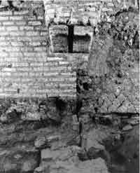15 Si conserva la sola metà meridionale della fogna costituita da una massicciata in conglomerato su cui poggiano avanzi del pavimento in malta idraulica e di una spalletta in opera laterizia alta allo stato attuale circa cm.50, comprendente un filare di tegole ogni due ricorsi di mattoni.