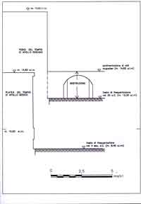 Per conoscere la posizione del lato sud della fondazione occidentale è stato eseguito un piccolo saggio di scavo ai piedi di quest'ultima (fig.1, n.3) poiché appariva ovvio che la parte sottostante il piano di calpestìo del corridoio della cantina fosse stata risparmiata dalla moderna opera di demolizione. Abbiamo pertanto potuto verificare che il taglio effettuato per la creazione del corridoio B e della nicchia per la botte che lo conclude a ovest ha intaccato superficialmente il lato sud della fondazione, in quanto la struttura antica risparmiata sotto l'attuale livello di calpestìo sporge solo cm.15 rispetto alla parte soprastante( distando così m.1,25 dal podio altorepubblicano).