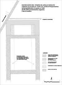 Nei muri in opus mixtum che delimitano l’intercapedine alle spalle del tempio abbiamo potuto individuare con certezza, come si è visto, almeno tre fasi. La prima sistemazione è forse un recinto di cantiere, connesso con una fogna provvisoria, che sarà stato realizzato mentre il muro perimetrale del basamento del tempio era in costruzione (fig. 10). Una volta terminato quest’ultimo si costruiscono i due muri in opus mixtum nella loro veste definitiva, scanditi da paraste (figg. 3, 12); segue una riparazione di un tratto del muro a sud e quindi la gettata della volta sopra la quale vengono allettate le lastre della pavimentazione dell’area scoperta. Questa sistemazione è sicuramente prevista fin dagli inizi. Ci sembra infatti che la funzione dei due muri in opus mixtum si inquadri perfettamente nell'ambito dei grandi lavori che portarono nell'arco di alcuni anni alla costruzione del tempio di Apollo e del retrostante portico a pilastri. Le due pareti costituiscono fondamentalmente delle robuste strutture di sostruzione, ulteriormente rinforzate dalle sequenze di paraste, con funzioni quella a sud di contraffortamento del podio del tempio quella a nord di sostegno della fila anteriore dei pilastri del portico, ma anche di contenimento verso valle di tutto l'insieme delle sostruzioni di tale edificio in quanto la faccia a sud aggetta quasi ottanta centimetri dalla fronte del portico soprastante. Tale insieme riceveva ulteriore assestamento dalla lunga volta a botte le cui spinte diagonali contrastavano la pressione esercitata dai due edifici che stavano ai lati e solo secondariamente serviva a sostenere la pavimentazione soprastante (fig. 2).