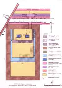 Un discorso ulteriore è quello della individuazione delle varie fasi della costruzione (figg. 10, 12). Leggendo i rapporti di cronologia relativa che intercorrono tra muri adiacenti non sempre è possibile capire con sicurezza se ci troviamo di fronte a una preordinata successione di fasi di cantiere oppure se quanto è stato aggiunto dopo sia frutto di un cambiamento del progetto. E’ il caso delle due fondazioni in opus caementicium che si appoggiano ai lati lunghi del muro perimetrale dalla parte interna (fig.12, n. 13, 14) le quali, come è stato giustamente proposto, dovevano sostenere la decorazione architettonica della cella, molto sporgente dalla parete, costituita probabilmente da un podio continuo – di cui resta un avanzo sopra il piano pavimentale della cella – su cui erano impostati due ordini di colonne (nota 24) . Va segnalato però che quella orientale, più visibile dell’altra, a sud si lega con la fondazione della fronte della cella – che è un elemento essenziale dell’edificio -, a nord insiste parzialmente sul setto in opera quadrata tangente al corridoio A della ex cantina, il quale a sua volta non è molto chiaro se si leghi al muro perimetrale, in ogni caso è stato edificato prima che il podio del tempio venisse riempito. Quest’ultimo elemento si trova in una posizione troppo eccentrica – dista appena ottanta centimetri dal muro perimetrale – per poter essere interpretato come mero setto di ripartizione delle gettate di riempimento e di raccordo fra strutture portanti, sul genere delle fondazioni a griglia o a telaio, anche perché non ve ne erano altri analoghi verso il centro (nota 25) . Per la sua collocazione sembra costituire piuttosto, insieme alla gettata in conglomerato che sta fra questo e il muro esterno, la parte più profonda della fondazione del colonnato della cella. L’impressione che si ricava in conclusione è che, pur ammettendo che il sistema decorativo in aggetto della cella, con il bancone continuo e i due ordini di colonne, sia frutto di un intervento di riprogettazione, tale evento si sia verificato in una fase in cui i lavori si trovavano a uno stadio iniziale, ove era completato solo il muro perimetrale del podio, ma non ancora la fondazione della fronte della cella e neanche si era provveduto a riempire la parte posteriore del basamento dell’edificio (nota 26) .
